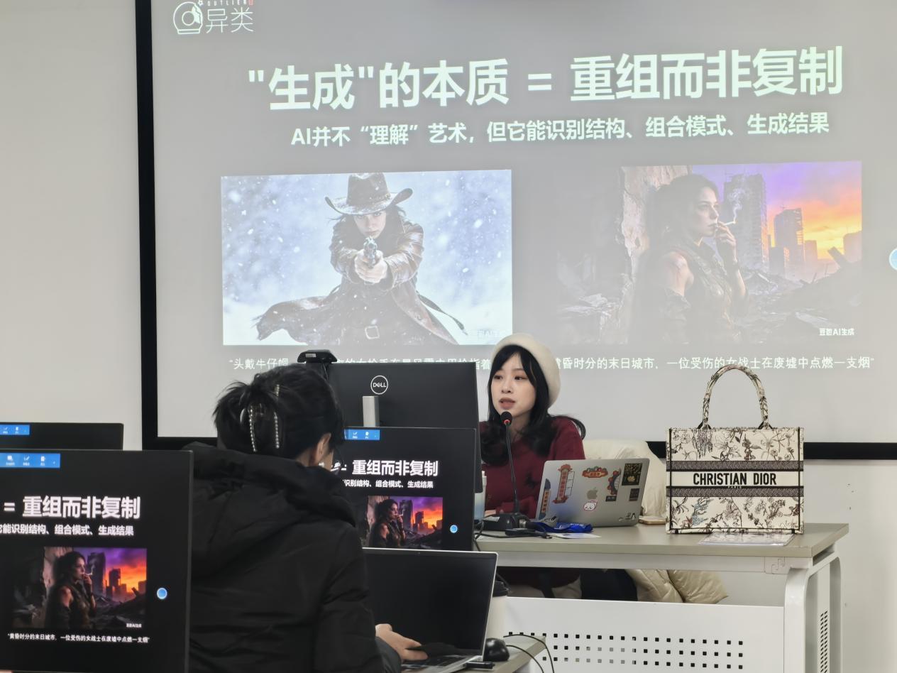 开课首日,周娴与吴悠老师便打破了“AI 只是工具” 的刻板认知。他们深入拆解 AI 模型体系的底层逻辑,从模型训练的技术原理讲到内容输出的全链路流程,不仅让学员读懂参数背后的深层意义,更教会大家如何将抽象的技术逻辑转化为可落地的创作方案。正如课程传递的核心观点:“生成”的本质是重组而非复制,AI 虽不“理解”艺术,却能精准识别结构、组合模式,成为创作者手中赋能灵感的强大助力。