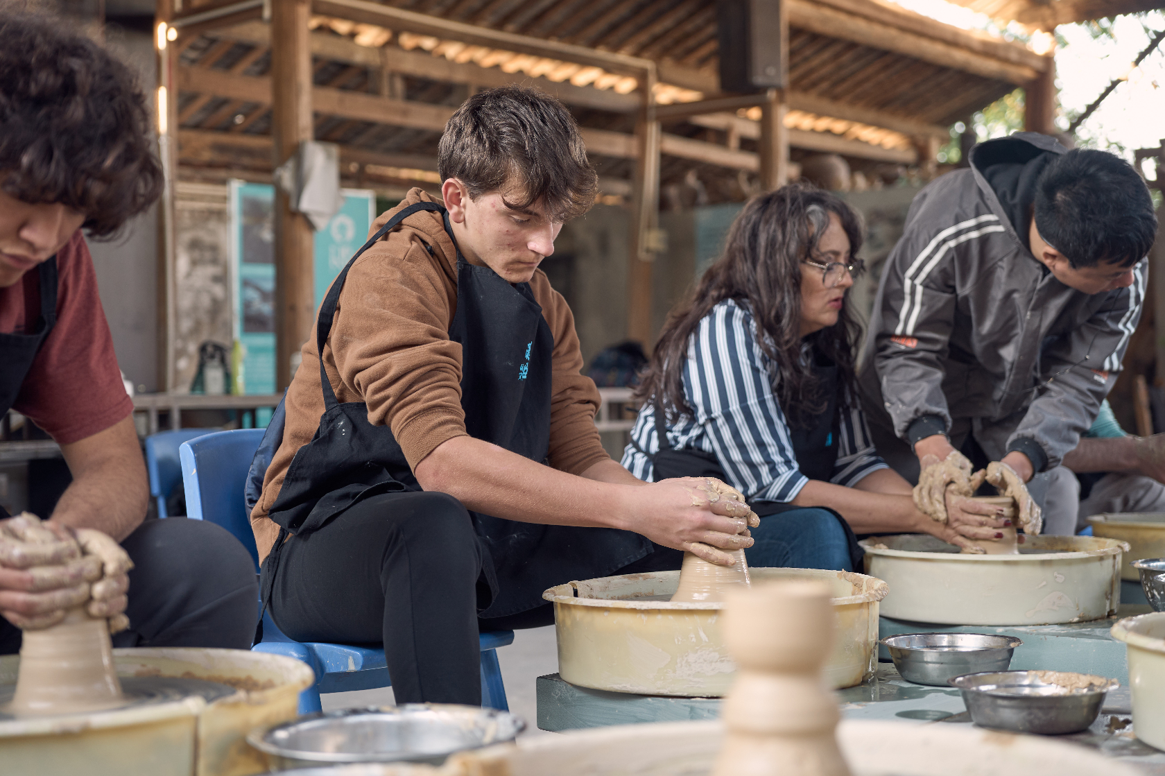 研学队伍走进温州陶山龙窑遗址,漫山窑址印记着千年制瓷史的痕迹。沿着窑道漫步,非遗传承人讲述龙窑依山而建、柴火烧制的古老工艺。在瓯窑博物陈列室,美国青少年触摸体会瓯窑的起源、兴盛与衰退,观察残片上留存的釉色肌理,仿佛穿越时光见证昔日窑火鼎盛的场景,陈列室里的一砖一瓦、一器一物,都成为鲜活的文化课堂,让大家领略瓯窑的历史脉络与非遗传承的坚韧力量。最受期待的瓯窑制作体验环节,研学队伍中的每一个人均化身“陶艺师”,围坐操作台旁开展实践。大家揉泥、拉坯、塑形,掌心托着柔软陶泥,随着拉坯机缓缓转动,指尖轻轻按压、提拉,松散的陶泥渐渐勾勒出杯、碗的雏形,尽情释放创意与想象。一位美国青少年谈到:“指尖沾满陶土,心间盛满热爱,这种体验让我感觉是在与中国的传统文化进行亲密的对话。”